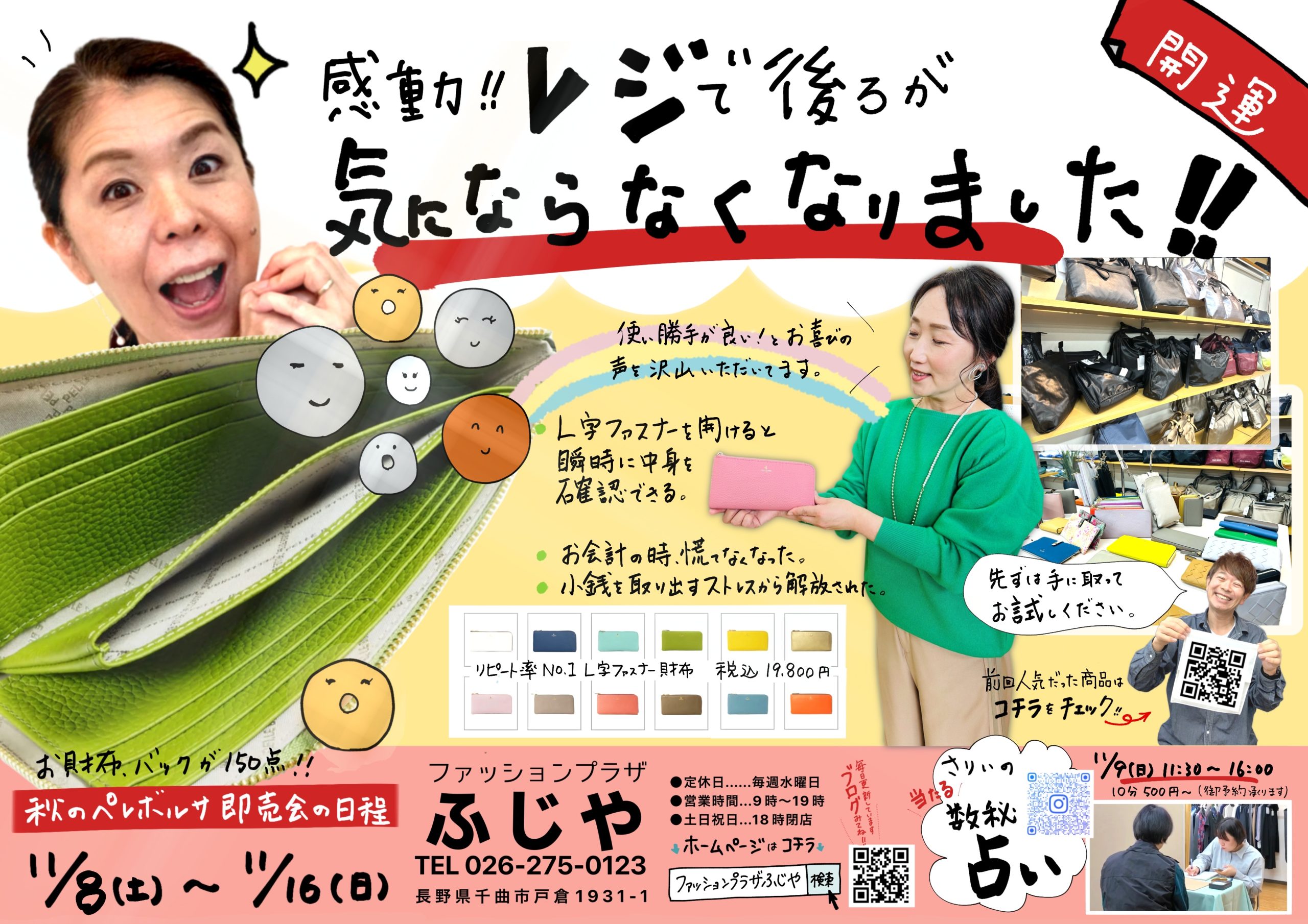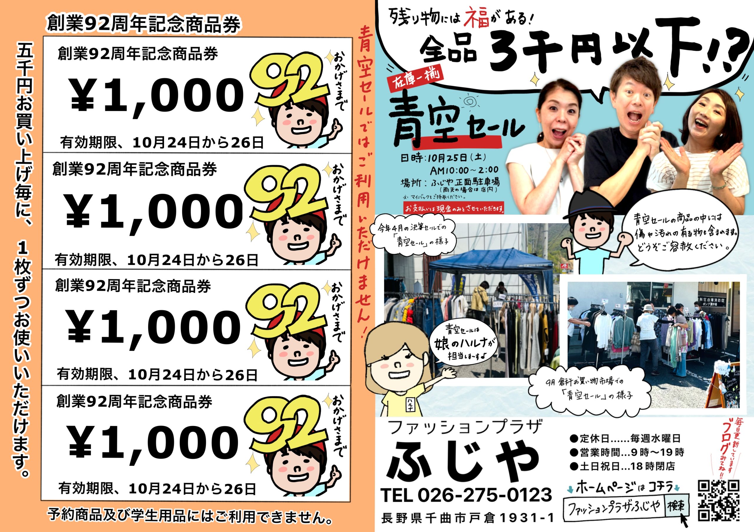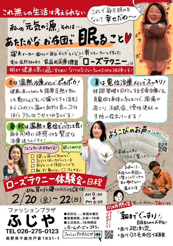毎日更新!ブログ 3代目社長・小林健二(通称:健ちゃん)のブログです! 笑顔と感動が集まるお店を目指す誠子店長のブログです。 お花とオシャレが大好きなミユキちゃんのブログです。 新着ニュースはこちらをCheck! ふじやはこんなお店です 笑顔とパワー☆をあなたに・・ ふじやを支えてくださっているのは、主婦の方や仕事を持つ女性のお客様です。年齢層は幅広いのですが共通点があります。それは「毎日、家族の為にガンバっている」という事!だからふじやに来た時は、日常を忘れて楽しんで行って欲しいんです!私達はそんなあなたに笑顔とパワーをジャンジャン降り注いじゃいます♡ ファッションプラザ ふじや代表取締役社長 小林健二 Access 〒389-0804 長野県千曲市大字戸倉1931−1 お気軽にお問い合わせください。026-275-0123受付時間 9:00 - 18:00 [ 水曜日除く ]
