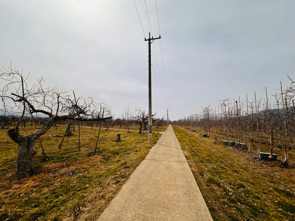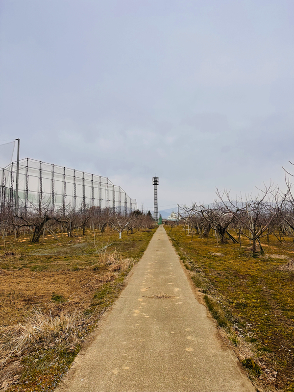 練習場のまわりには、ずーっと続くりんご畑。東西に伸びる細い道を、木箱を積んだトラクターが行ったり来たりしてる風景を思い浮かべながらテクテク。