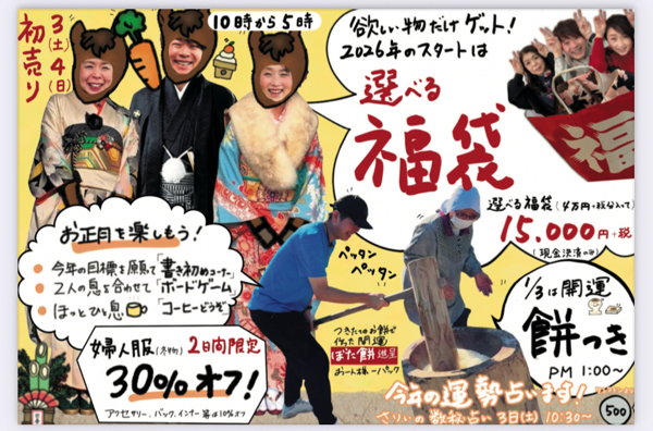 なお、この日は初売り!二日間だけの冬物婦人服30%オフのほか、選べる福袋もあります(^。^)