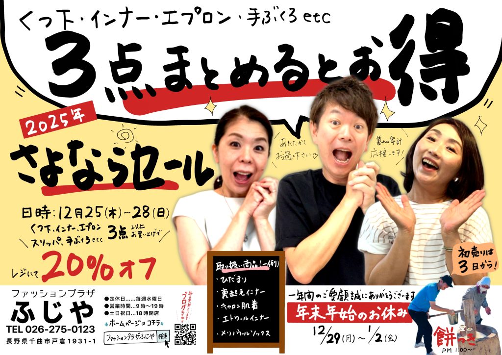 さよならセールは25日(木)から。なお、年末年始のお休みは、12月29日(月)から1月2日(金)までとなります♪