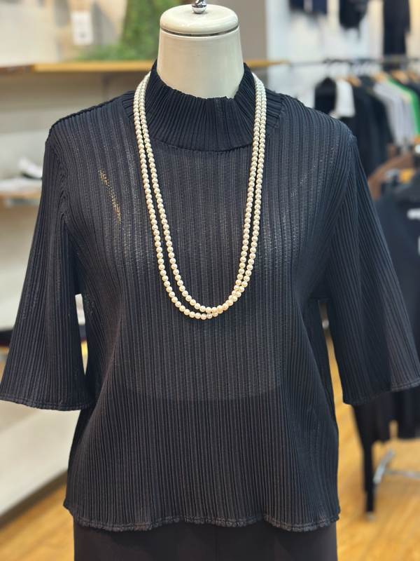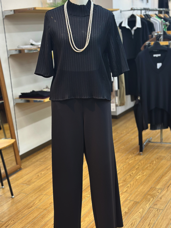 お持ちいただいたニットジャケットに合わせて、襟が詰まったカットソーをインナー用に。(実際は黒じゃなくてアイボリー)