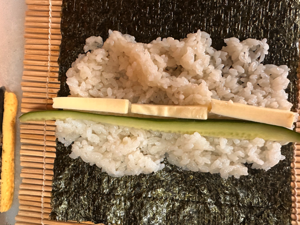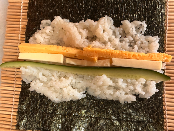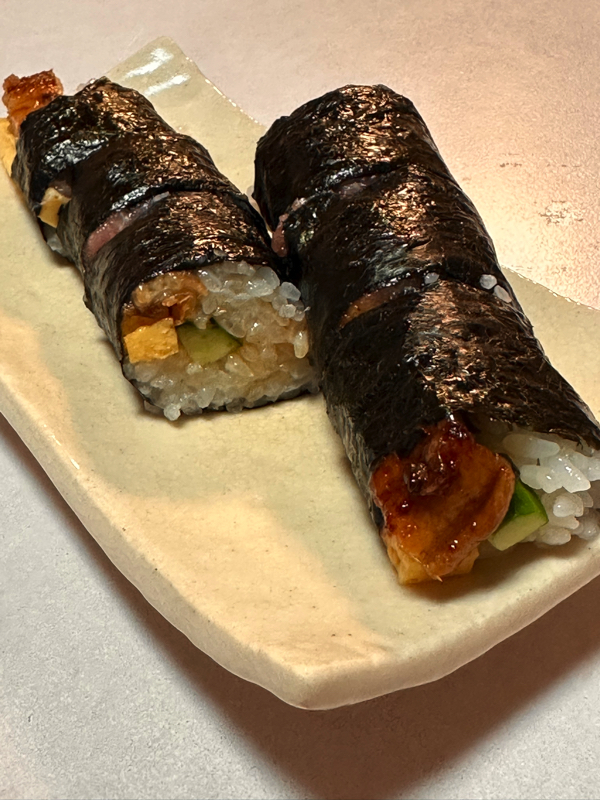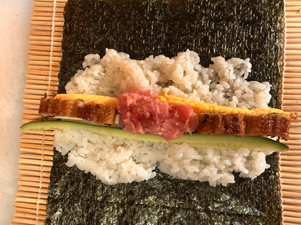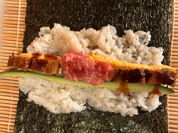 きゅうり、チーズ、卵、うなぎ、ネギトロを巻いて巻いて〜♪